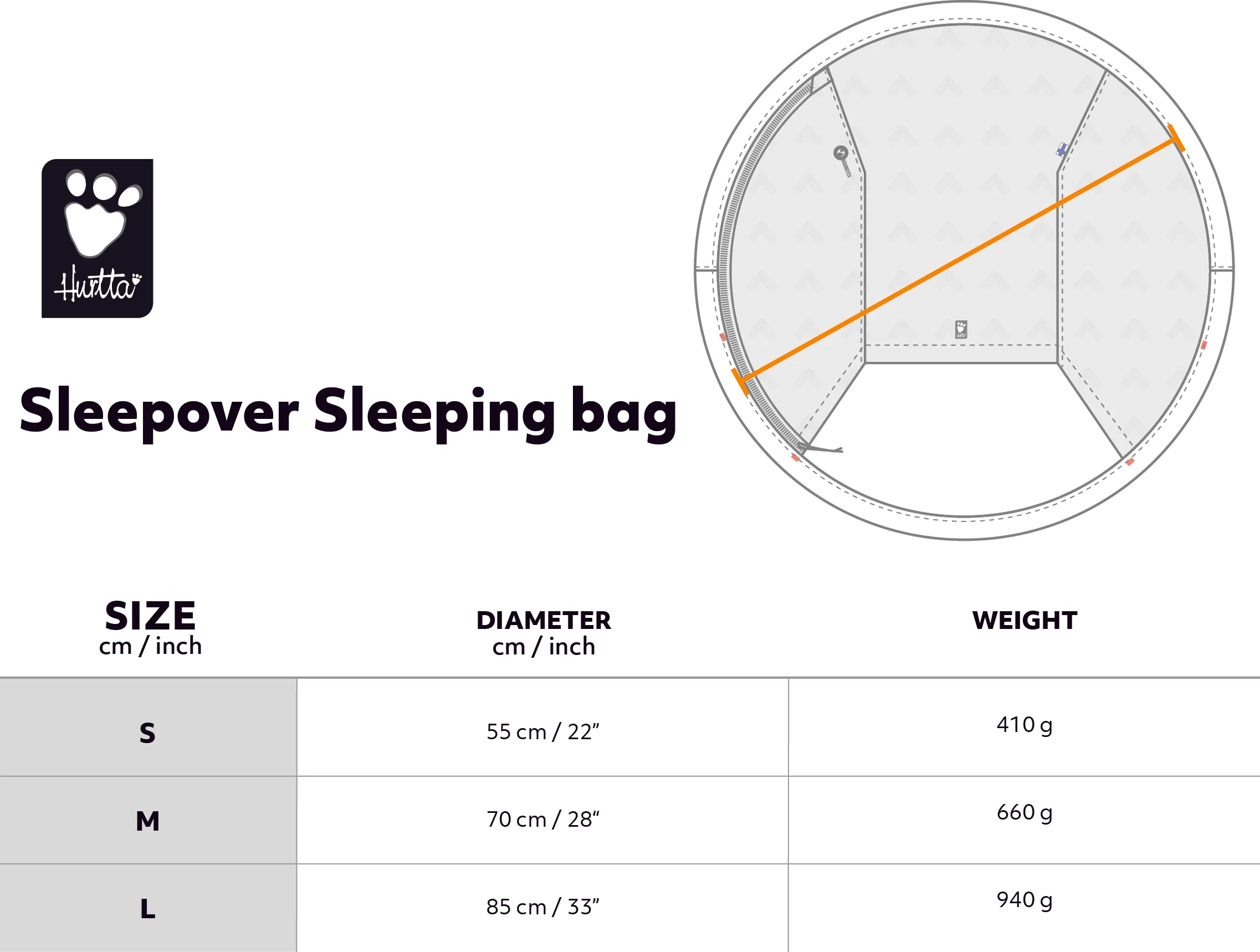 Når du velger den perfekte størrelsen på din Sleepover-sovepose, bør du ta hensyn til hundens favoritt-sovestilling. Ruller den seg sammen til en koselig ball? Hvis ja, velg ganske enkelt den oppmålte diameteren i størrelsestabellen ovenfor. Men hvis hunden din foretrekker å strekke seg ut på magen eller sove på ryggen med beina i været, kan det være lurt å velge en større størrelse for disse villere sovestillingene.